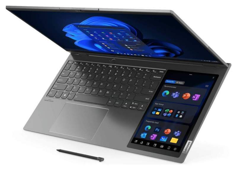 Společnost Lenovo Na letošním veletrhu CES 2022 v Las Vegas představila nový ThinkBook s velkým 17.3palcovým ultraširokým hlavním displejem (poměr stran 21:10) a doplňkovým 8palcovým displejem vedle klávesnice.